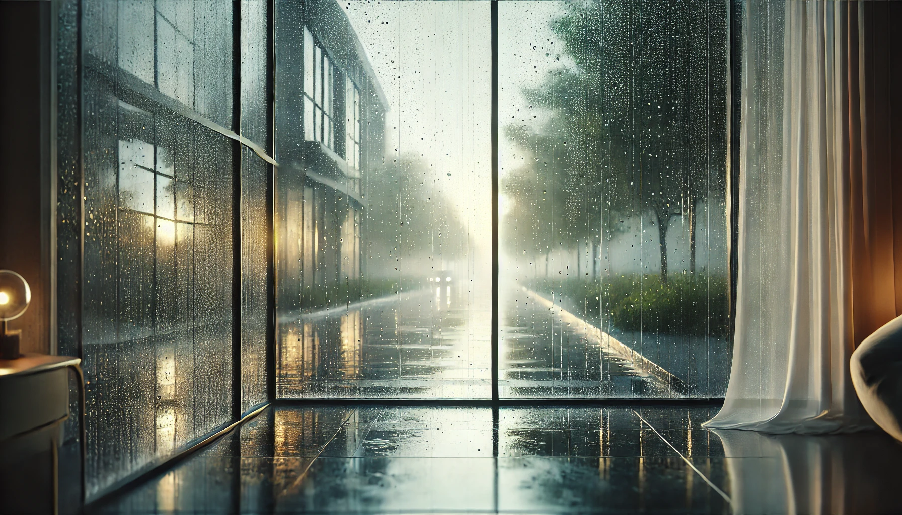 비 오는 날의 풍경은 평소에 보던 세상을 전혀 다른 모습으로 바꿔놓습니다. 흐릿한 유리창 너머로 보이는 나무와 건물들은 마치 안개 속에 감춰진 듯 신비로운 분위기를 자아냅니다. 길가의 빗물 웅덩이에 비치는 하늘과 주변 풍경은 또 다른 세상을 만들어냅니다.